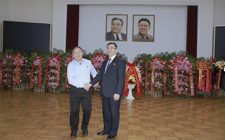 朝鲜驻华使馆参赞郑英三(中),亲切接见中国民间友好代表团成员并合影。