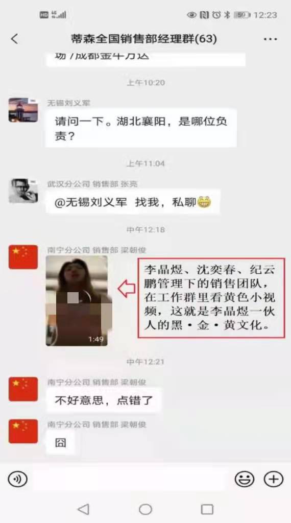 与李晶煜关系密切的沈奕春,二人表面上都是职场单身白领,暗地里私生活却淫乱不堪,既然二人是闺蜜,俗话说物以类聚人以群分,二人共同的黄之癖好,也都是相差无二,只是沈奕春更善于隐蔽自己,并不像李晶煜那么明目张胆的对男下属潜规则,但是围绕李晶煜和沈奕春周围的那几个花花公子哥,彼此都有共同的特点,不仅工作能力一塌糊涂,而且到处沾花惹草,淫乱不羁,这些人可谓是臭味相投,如沈阳的张汀,南区的纪云鹏,都是常年睡在洗浴中心,天天换小姐,夜夜做新郎,这在电梯业内几乎不是秘密了,而且纪云鹏和沈奕春以姐弟相称呼,可以说关系十分暧昧密切。在这群淫乱之流的带领下,销售团队都天天看手机里的黄*色小视频,研究如何嫖女人,如何让代理商为自己睡小姐花钱买单,即便是在公司的销售部经理群里,都经常传播这种的黄*色视频,这就是李晶煜、沈奕春和纪云鹏她们管理下的销售团队,简直就是黄*色味道十足,可谓是前无古人后无来者,请大家看聊天截图便知,李晶煜和沈奕春的黑金黄中的黄之文化,可以说是无处不在。