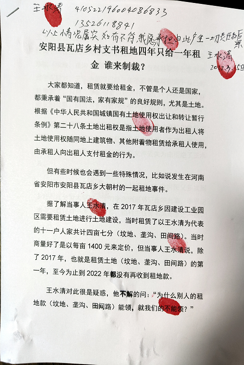 安阳县瓦店乡村支书租地四年只给一年租金 谁来制 裁?