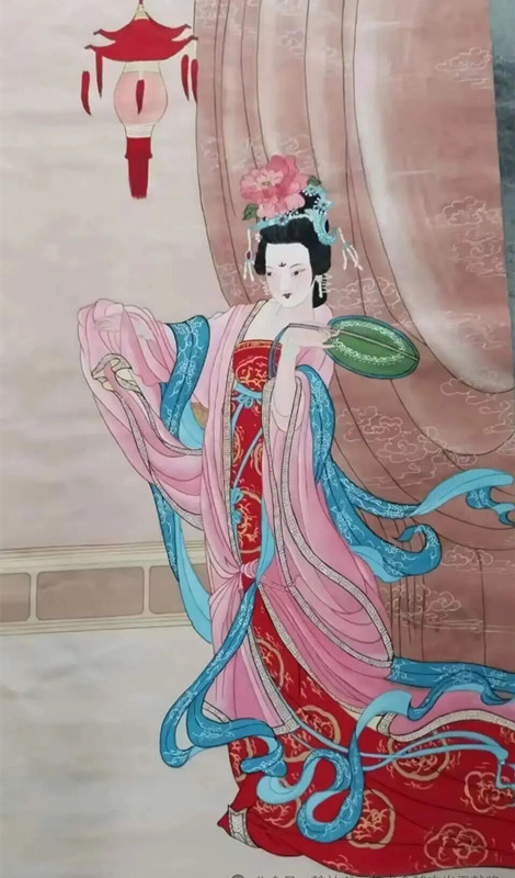 画面采用了传统的竖幅构图方式,近景、中景与远景相互映衬,形成了一个深远的空间感。近景处,河流蜿蜒,岸边岩石嶙峋,树木错落有致;中景部分,瀑布飞泻而下,几座白墙黑瓦的房屋点缀在色彩斑斓的山林间,增添了生活气息;远景里,连绵的山脉在云霞之间,湖水中鱼虾潜游,引来成群夜鹭、鱼鹰等在湖面低空中翱翔起舞,使画面更具动感与生机。